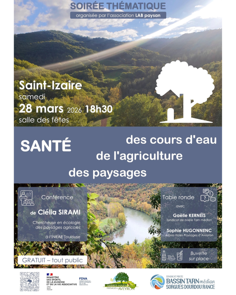 L’association LABpaysan vous invite à une soirée conviviale autour des enjeux liés à la gestion et au maintien de nos paysages agricoles et ruraux. TOUT PUBLIC – GRATUIT samedi 28 mars 2026 -> 18h30 Saint Izaire (sud Aveyron) -> Salle des fêtes Conférence de Clelia Sirami chercheuse en écologie des paysages à l’INRAE (Toulouse) Table ronde avec Gaëlle Kernéïs du […]