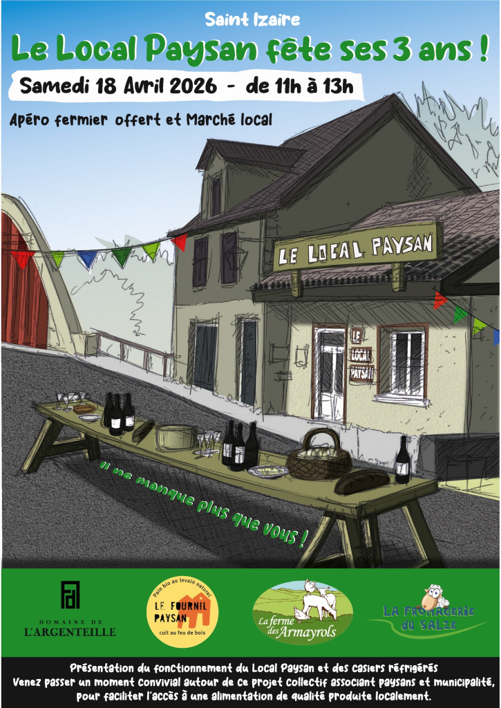Le Samedi 18 Avril de 11h à 13h sur la place de la Bascule (ou sous la halle de L’Auberge de La Valette s’il pleut ! ) les producteurs locaux du Salze, des Armayrols, de Salelles et Adrien Vassas du Domaine de l’Argenteille invitent les habitant·e·s du village et des alentours, à déguster leurs produits et boire un verre pour fêter les 3 ans du Local Paysan.